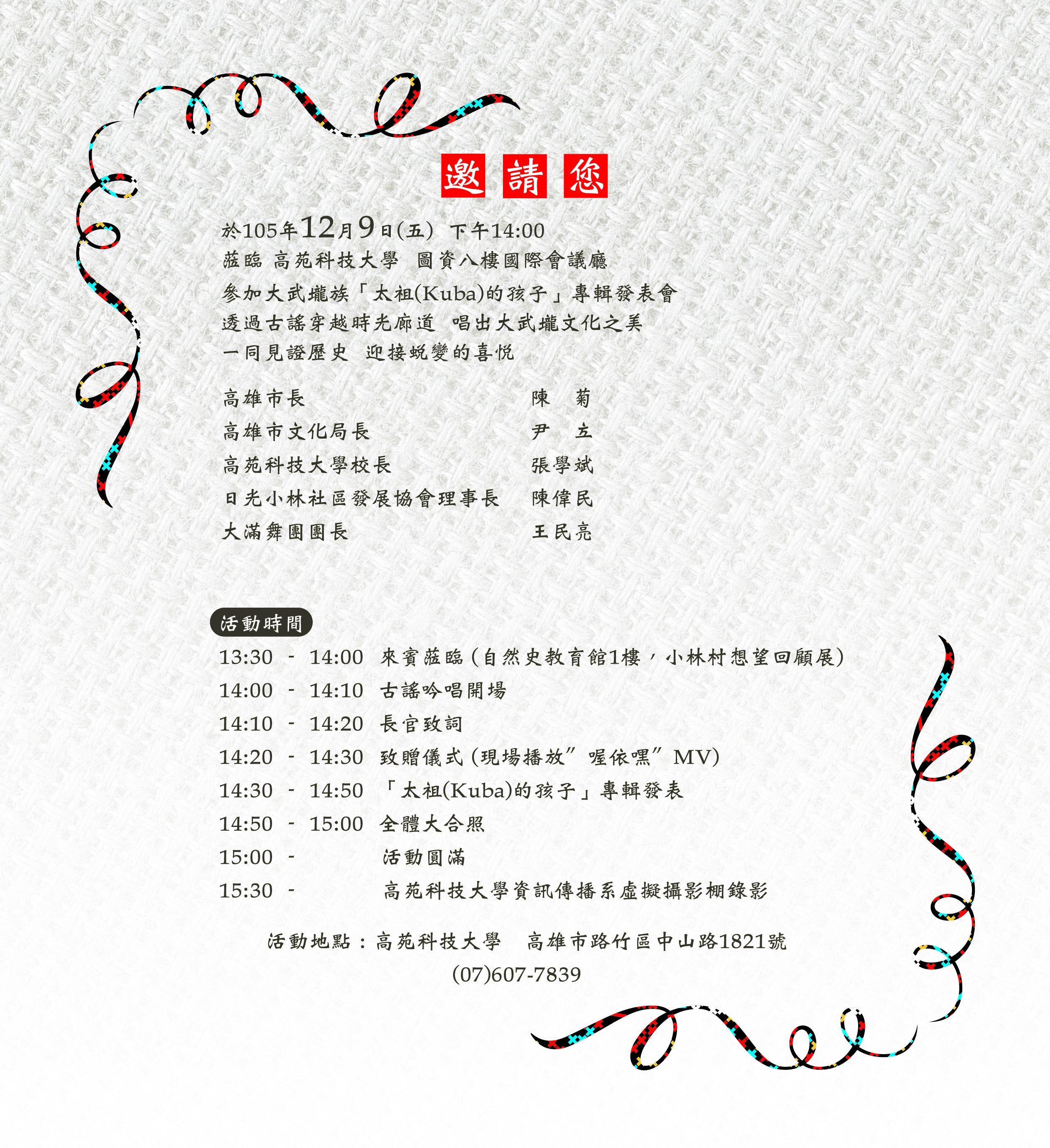 1 12 月 2016 12/9『太祖(kuba)的孩子』 大武壠族 ,小林部落古謠專輯發表會 by taivoan | posted in: 日光小林, 歌舞文化 | 0 『沒有什麼比大家聚在一起唱歌跳舞,更快樂的事了 因為一同經歷過,現在的我們,更珍惜彼此』 牽戲,牽繫。 手牽著手,心與心彼此相繫 我們努力的學習,大聲的唱 這是來自小林部落的聲音 『太祖(kuba)的孩子』 大武壠族//小林部落古謠專輯 即將溫暖發聲 邀請大家,12/9(五) 14:00參與這張專輯的發表會 地點:高苑科技大學/自然史教育館B1 您的支持,是我們最堅強厚實的力量 文字/郭萬蔚 圖片來源/大滿舞團